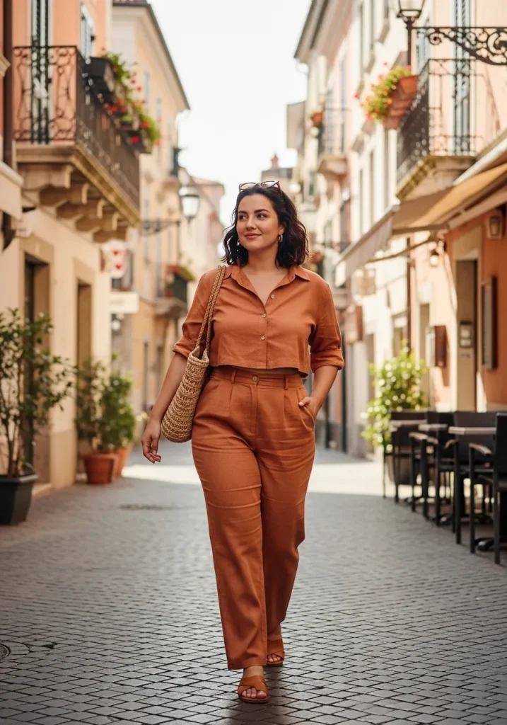 A matching linen set creates a coordinated and effortlessly chic European outfit. The breathable fabric keeps you cool while the matching pieces make styling easy. It’s ideal for both exploring and relaxing. This outfit feels polished without effort.
