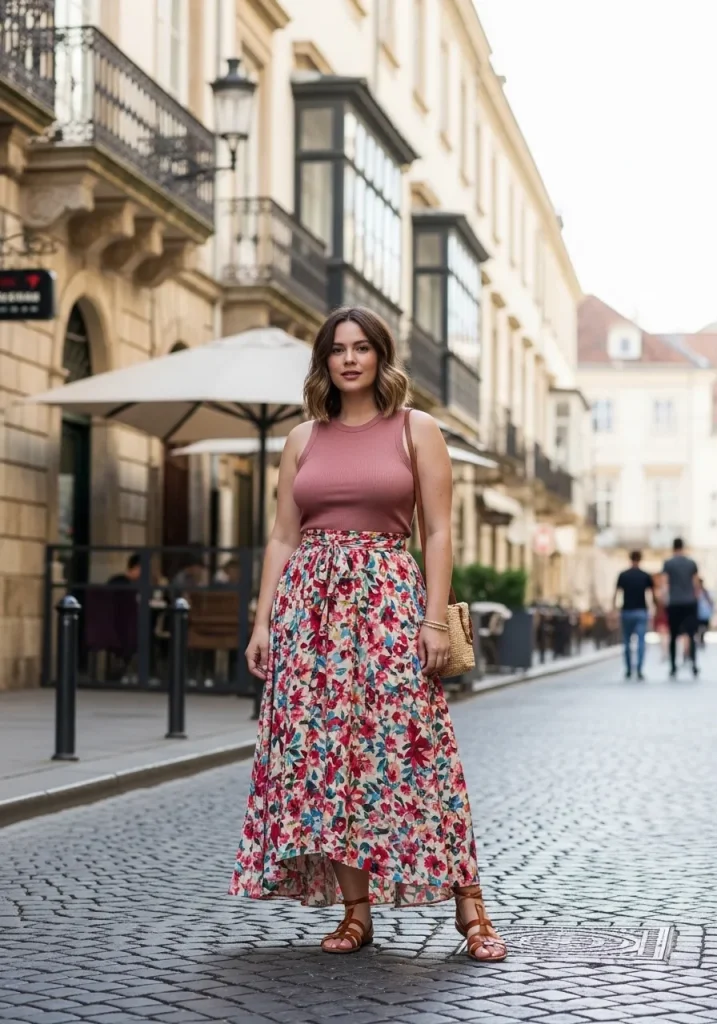A maxi skirt paired with a tank top creates a soft and elegant outfit that works perfectly for European summer days. The long skirt adds movement while the tank keeps the outfit breathable. It’s perfect for both daytime exploring and relaxed evenings. This look feels balanced and chic.