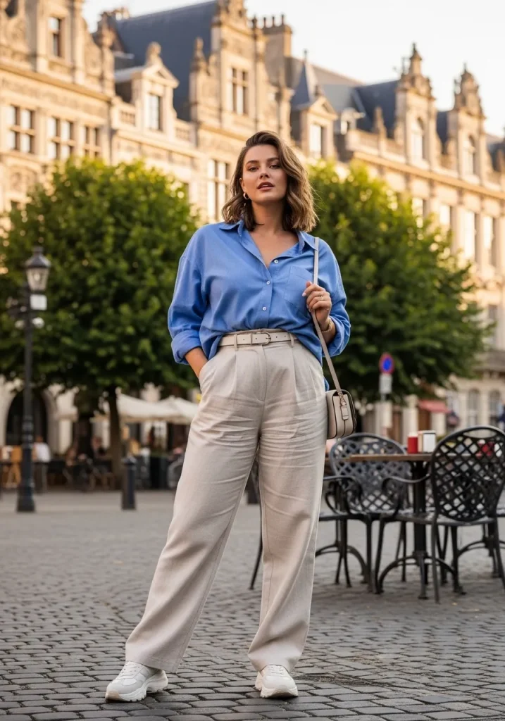 A linen shirt paired with high-waisted shorts creates a breathable and polished outfit that’s perfect for warm European days. Linen keeps you cool while still looking refined, making it ideal for sightseeing or casual outings. This outfit feels clean and effortless.