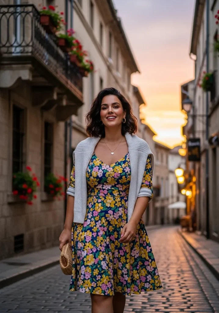 A floral dress paired with a straw hat creates a dreamy and romantic European summer outfit. The soft prints and flowy fabric feel perfectly in sync with scenic streets and coastal views. It’s ideal for vacations and photo moments. This outfit feels feminine and effortless.
