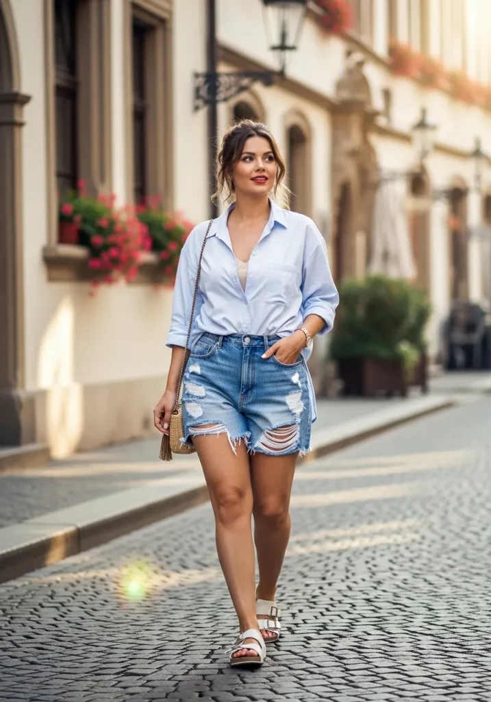 Denim shorts paired with a button-down shirt create a classic and versatile European summer outfit. The structured shirt balances the casual feel of the shorts, making the look polished yet relaxed. It’s perfect for casual city days. This outfit feels timeless and easy.