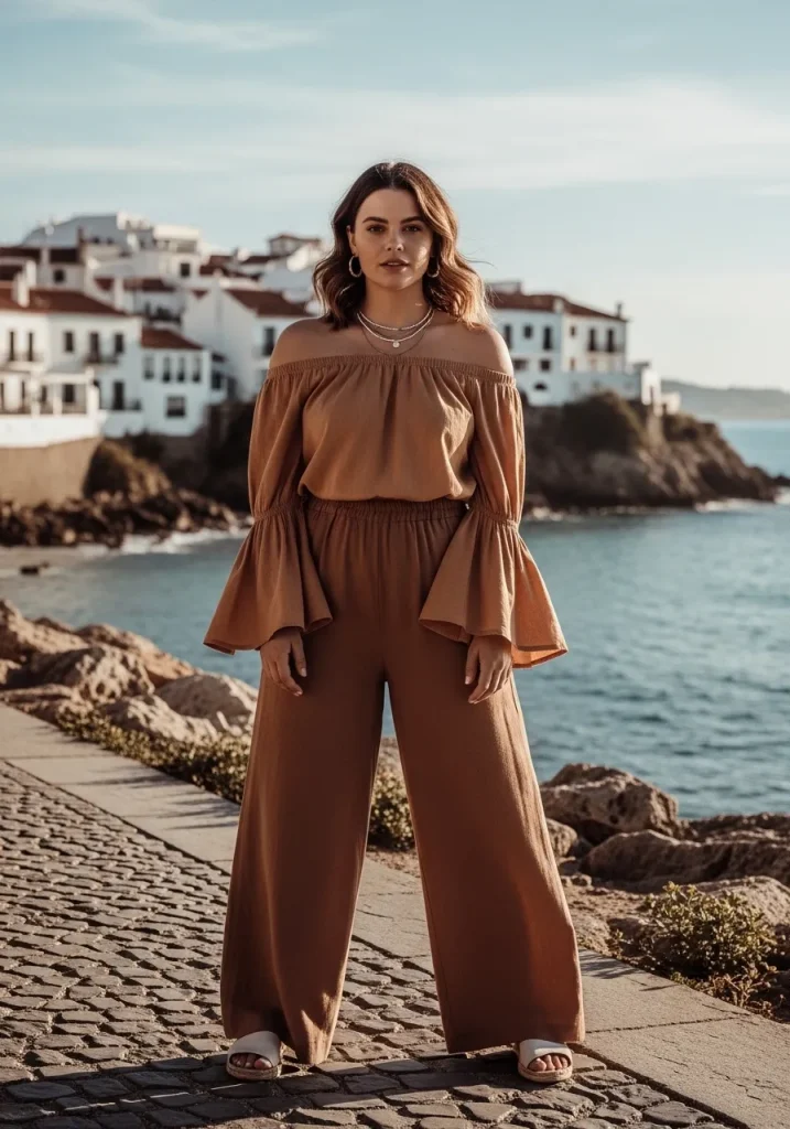An off-shoulder top paired with wide-leg pants creates a breezy and elegant outfit perfect for summer in Europe. The open neckline adds a feminine touch while the pants keep the look relaxed and comfortable. It’s ideal for both day and evening outings. This outfit feels romantic and chic.