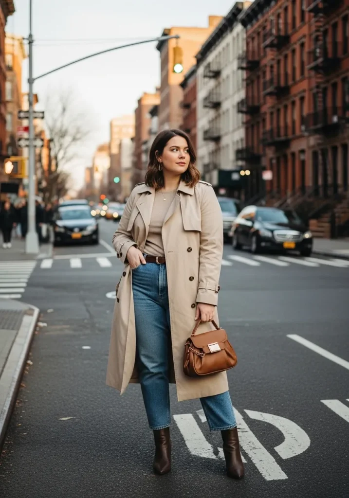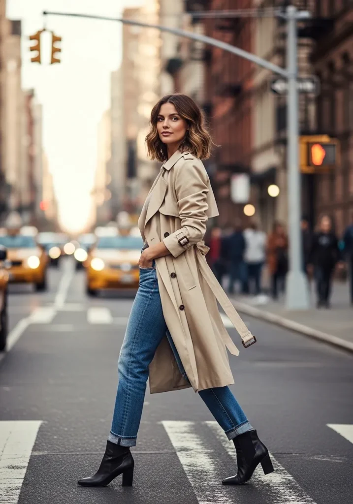 A classic trench coat paired with straight-leg jeans is one of the most iconic New York spring outfits you can wear. The trench instantly adds structure and polish, while the jeans keep the look relaxed and wearable for everyday city life. This combination is perfect for those unpredictable spring days when layering is essential.