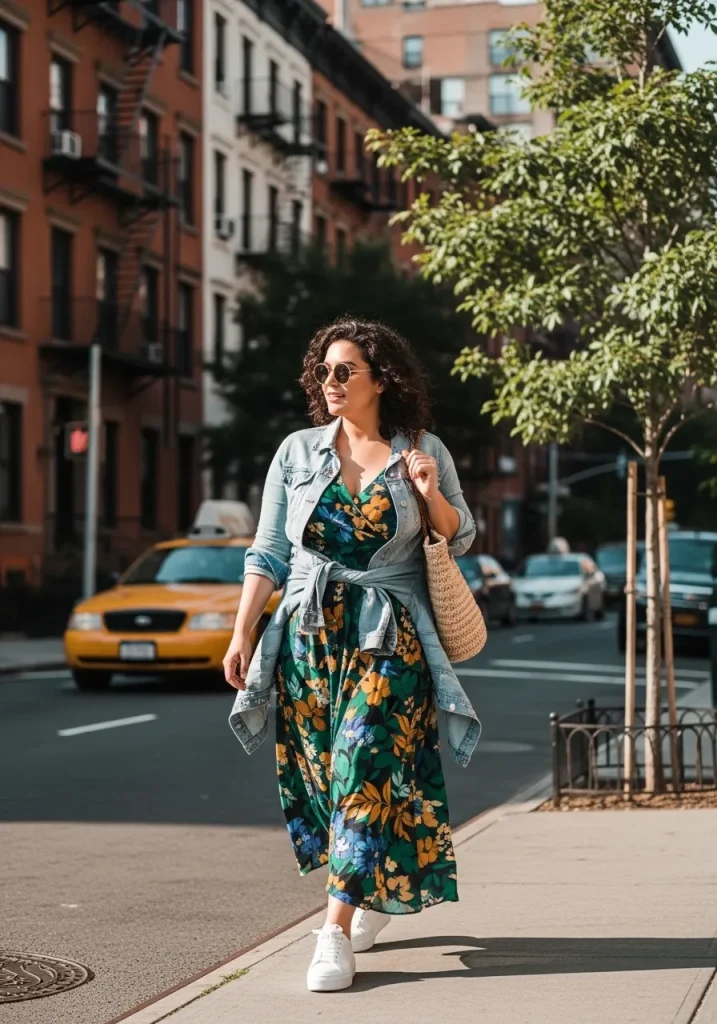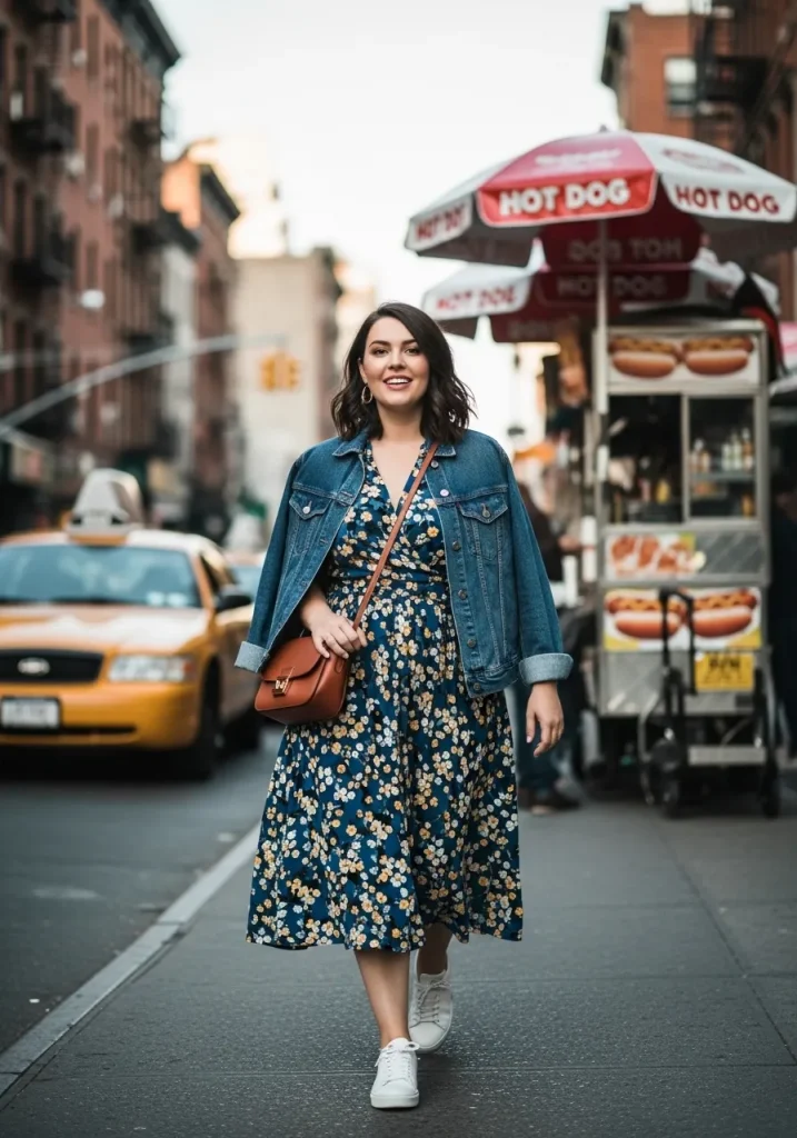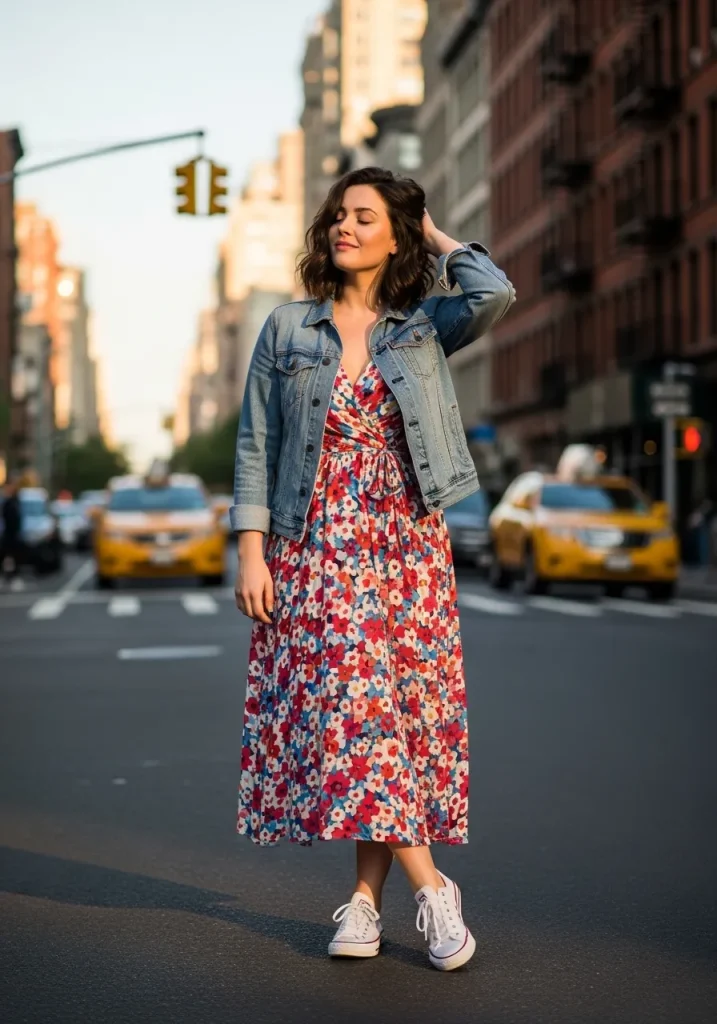 A denim jacket layered over a midi dress creates a casual yet put-together look that’s perfect for spring in New York. The jacket adds a relaxed vibe while the dress keeps the outfit feminine and flowy, making it ideal for daytime exploring.