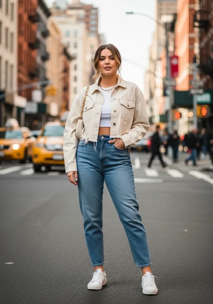 A cropped jacket styled with high-waisted jeans is flattering, trendy, and perfect for spring layering. The shorter jacket highlights your waist while the jeans create a clean and structured base for the outfit.