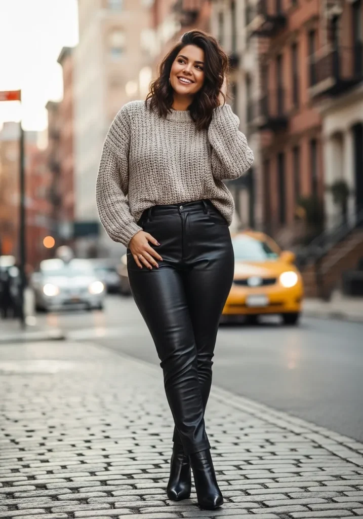 A soft knit top paired with leather pants creates a bold yet balanced outfit that feels very New York. The contrast between cozy and edgy textures adds depth and personality to your look. It’s a great option for slightly cooler spring days.