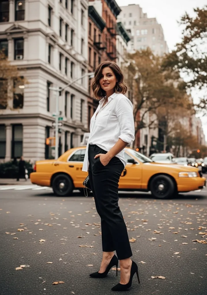 A crisp white shirt with black trousers is the definition of timeless New York style. It’s clean, sharp, and always appropriate no matter the occasion.