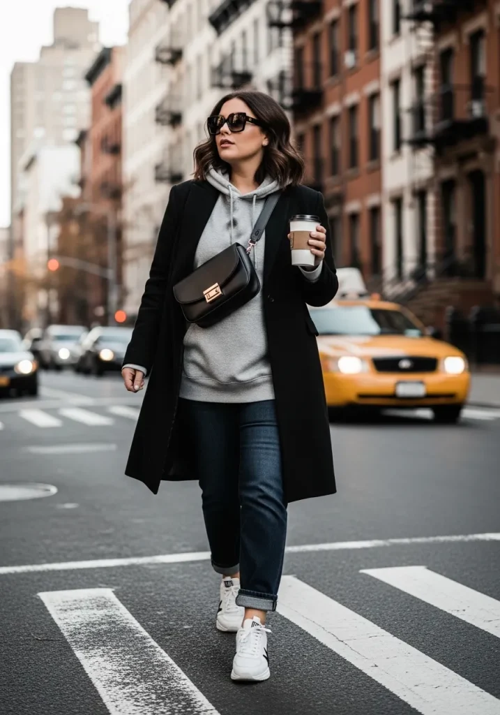Layering a hoodie under a tailored coat creates a trendy, off-duty model vibe that’s very popular in New York. It’s comfortable while still looking intentional and stylish.