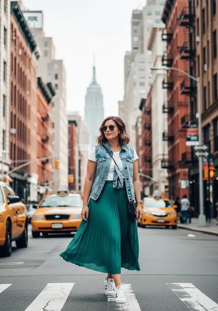 A pleated skirt styled with sneakers creates a perfect mix of feminine and casual. The movement of the skirt adds elegance while the sneakers keep the outfit practical for walking.