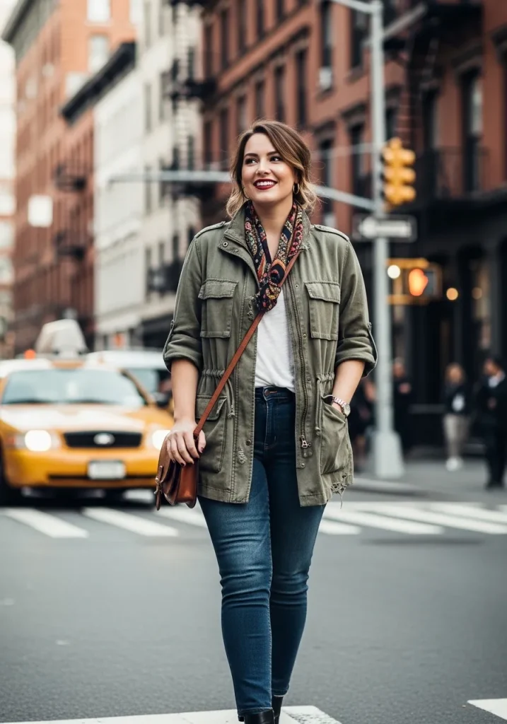 A utility jacket adds a slightly rugged, casual vibe to your outfit while still keeping it stylish. Paired with skinny jeans, it creates a balanced and easy-to-wear look.