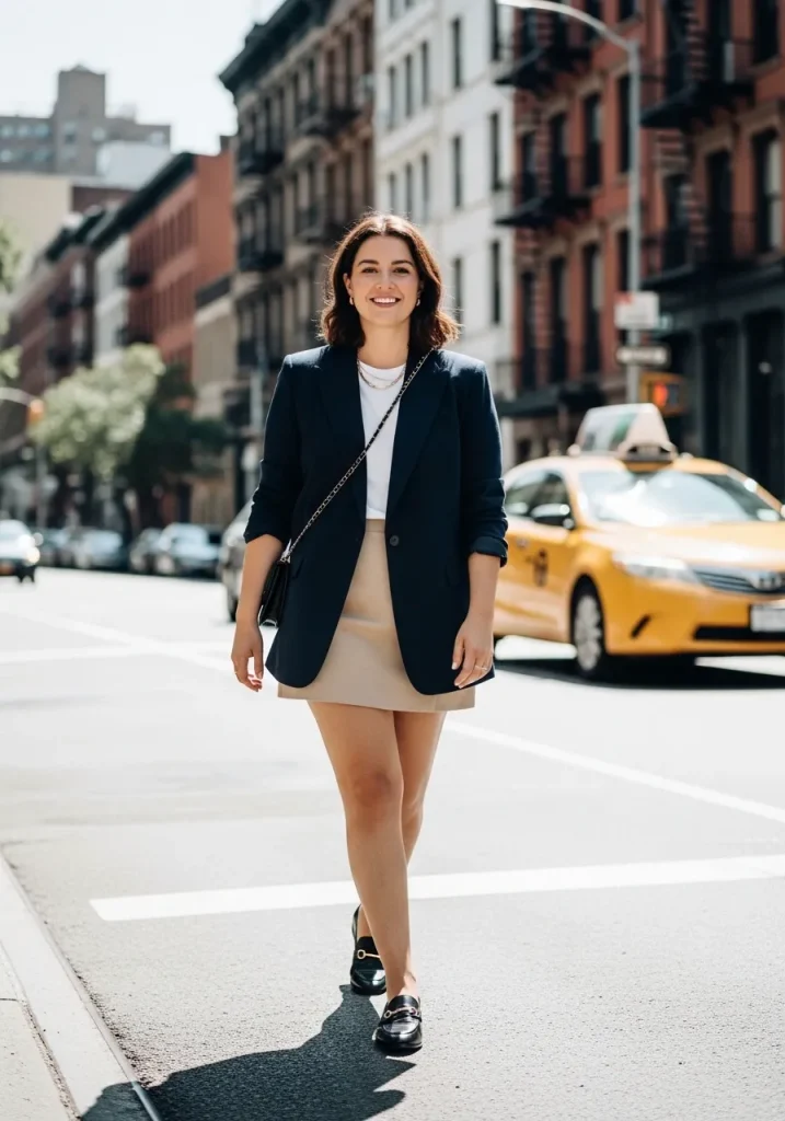 A tailored blazer styled with a mini skirt creates a perfect balance between polished and playful. This outfit captures that classic New York fashion energy—structured yet effortlessly cool. It’s ideal for brunch dates, casual meetings, or a stylish day out in the city.
