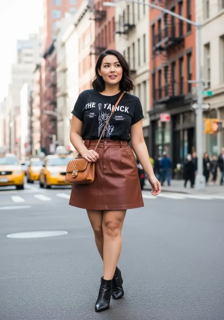 A graphic tee paired with a leather skirt creates a fun, edgy look that still feels wearable. It’s a great way to mix casual and statement pieces.