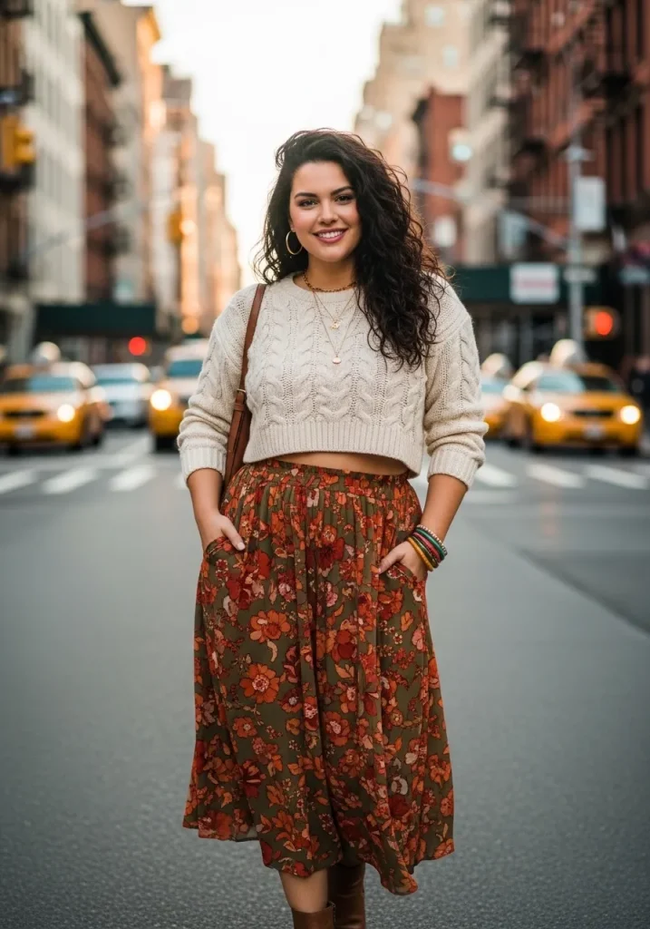 A cropped sweater paired with a midi skirt creates a flattering and cozy outfit that works well for spring. The cropped length highlights your waist while the skirt adds movement.