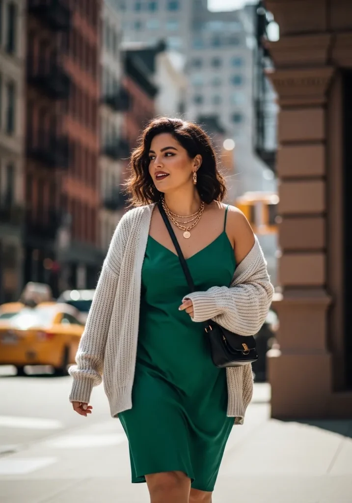Layering a cardigan over a slip dress creates a cozy yet elegant outfit that’s perfect for transitional weather. It’s soft, feminine, and easy to style.