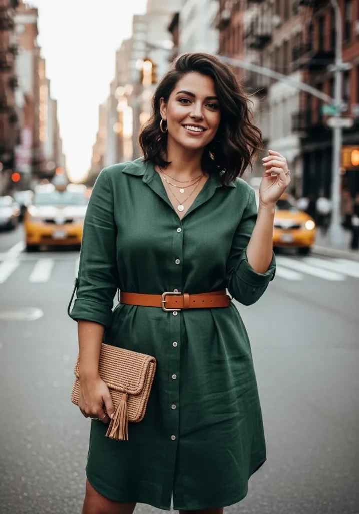 A button-down dress with a belt creates a structured and flattering silhouette that feels both classic and modern. It’s a great one-piece outfit for busy days.