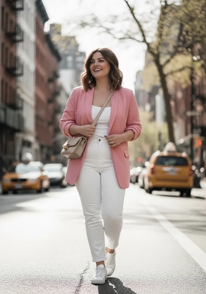 A pastel blazer paired with white jeans creates a fresh and bright spring look. It’s perfect for adding color while keeping the outfit clean and elegant.