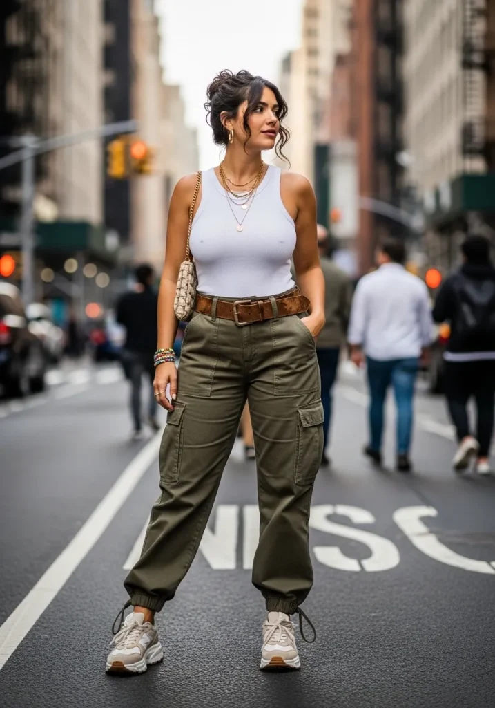 A simple tank top paired with cargo pants creates a trendy and relaxed outfit that feels very street-style inspired. It’s comfortable yet stylish.