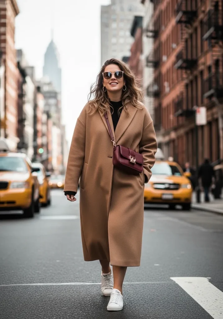 A long coat styled with sneakers creates a perfect mix of polished and casual. It’s ideal for cooler spring days when layering is key.