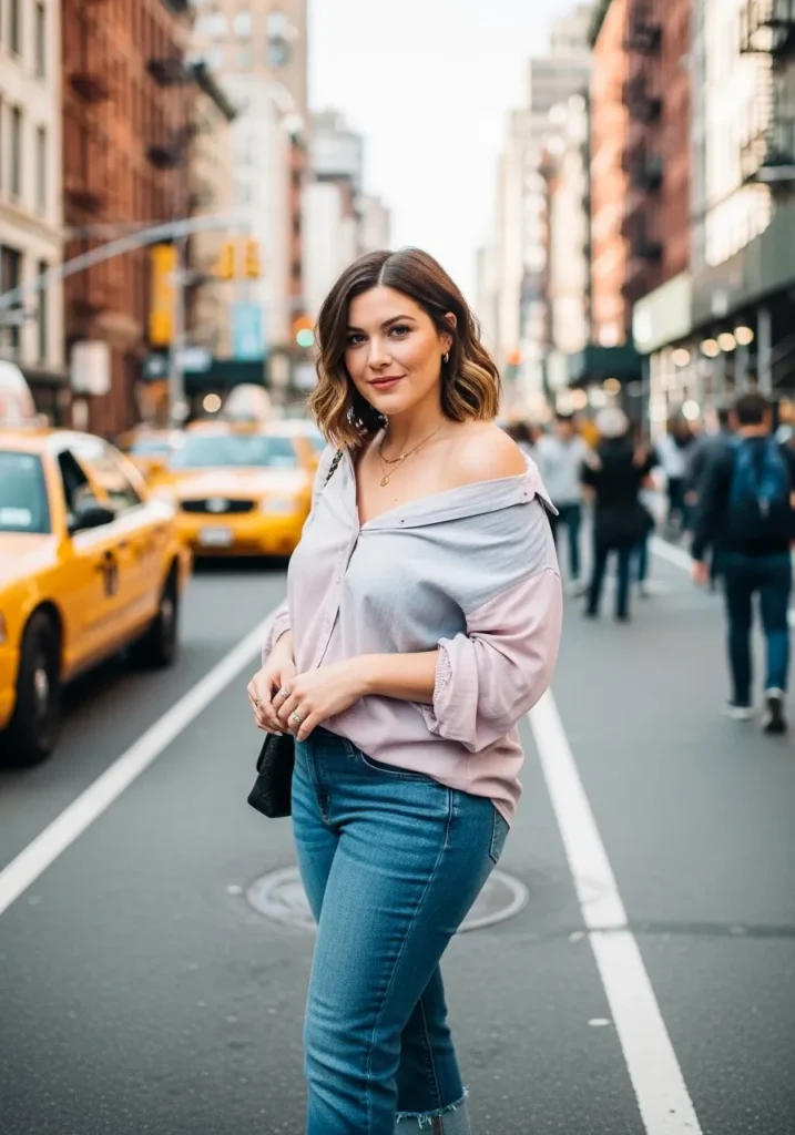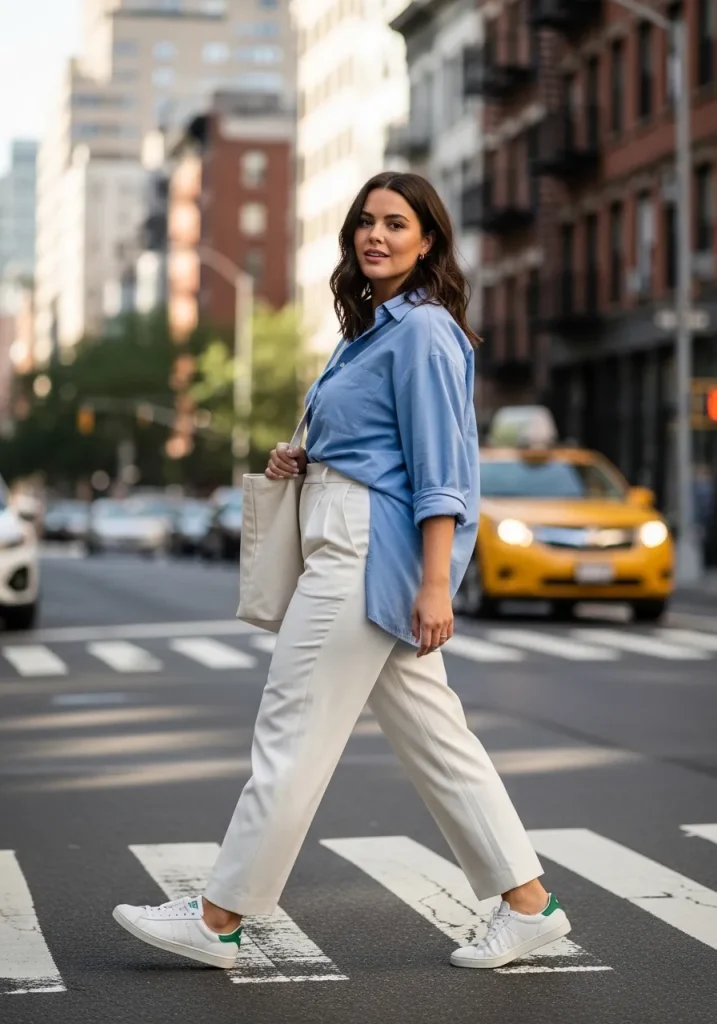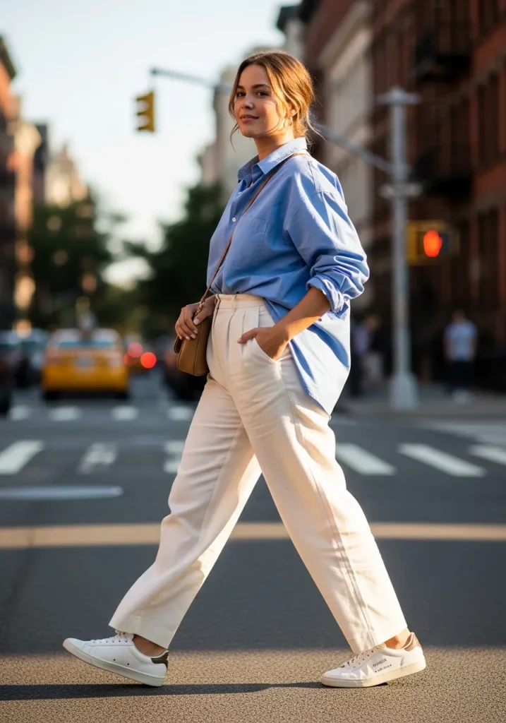 An oversized button-down shirt paired with wide-leg trousers creates a relaxed yet elevated look that feels perfectly in sync with New York street style. The loose silhouette offers comfort while still looking intentional and fashion-forward. It’s ideal for busy days when you want to look put-together without trying too hard.
