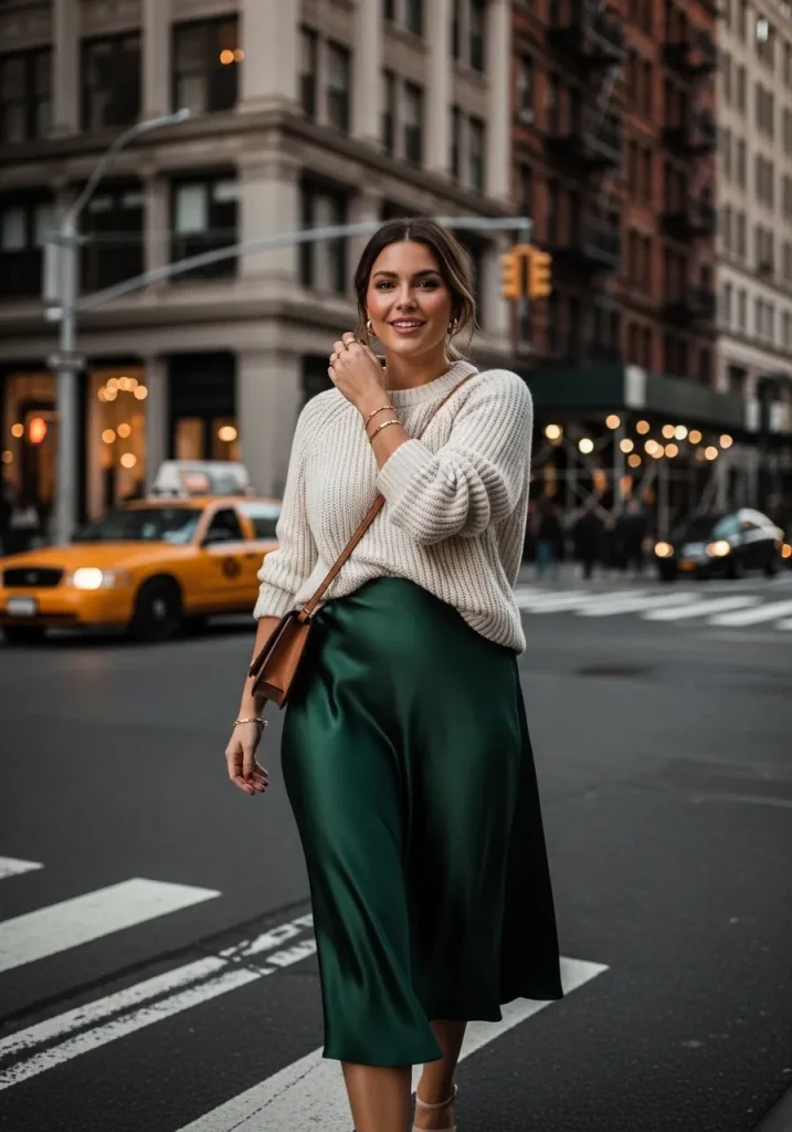 A satin skirt paired with a sweater creates a beautiful contrast between soft and cozy textures. It’s perfect for transitional weather.