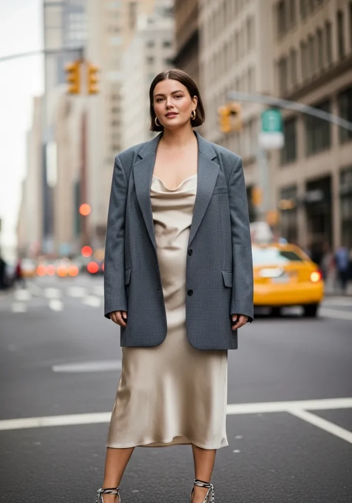 A silk camisole layered under a blazer creates a soft yet structured outfit that feels elegant and modern. It’s perfect for evenings or slightly dressier occasions.