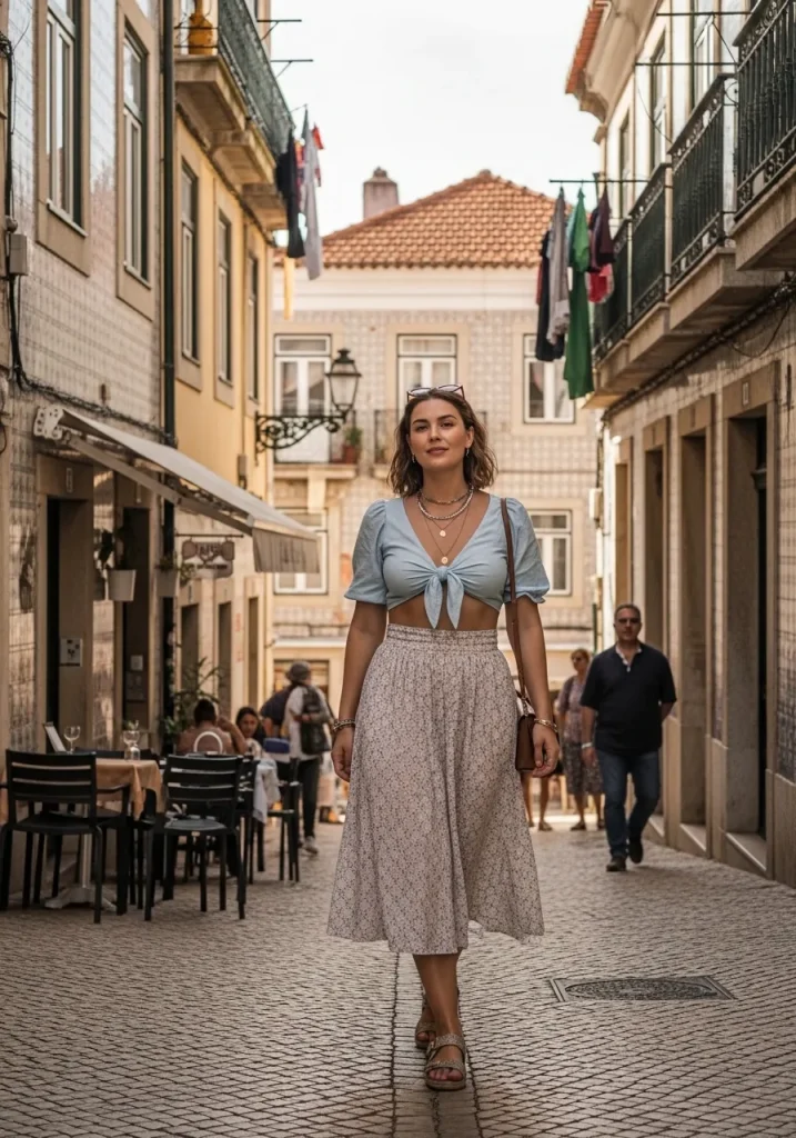 Pair it with flat sandals or espadrilles to keep the look relaxed yet stylish. Add a woven bag, oversized sunglasses, and delicate jewelry to enhance the vacation vibe. Soft prints or neutral tones work beautifully with Portugal’s scenic backdrops. This outfit feels feminine, airy, and perfect for travel days.