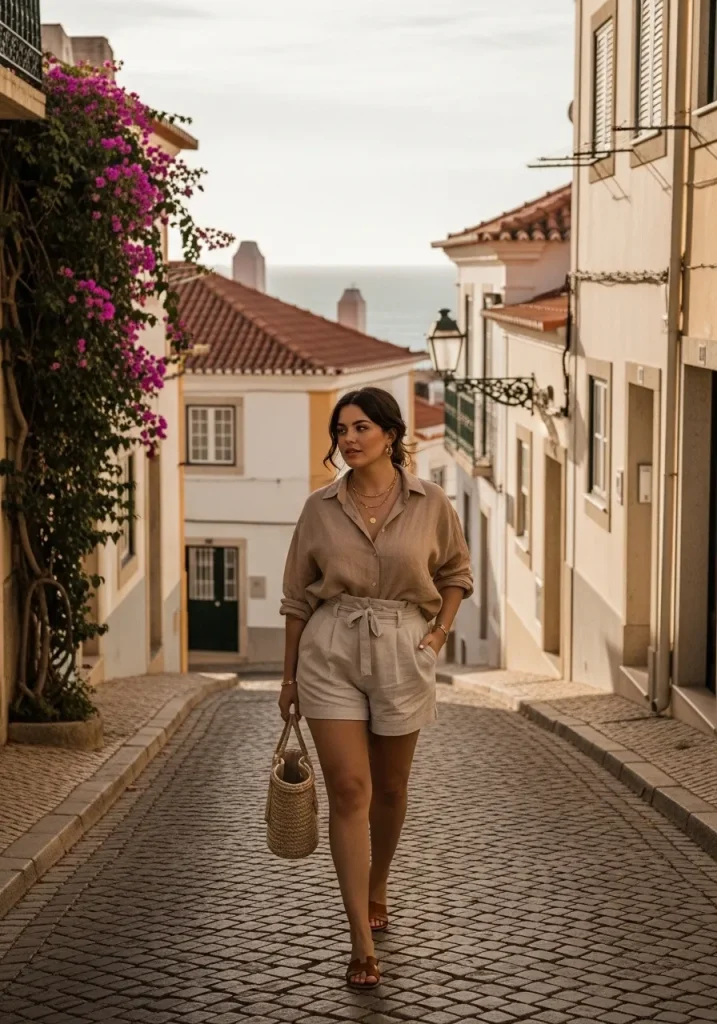 A linen shirt paired with shorts creates a breathable and effortless outfit that’s perfect for warm Portuguese weather. Linen fabric keeps you cool while still looking chic and relaxed. This combination is ideal for casual sightseeing days or grabbing coffee at a local café.