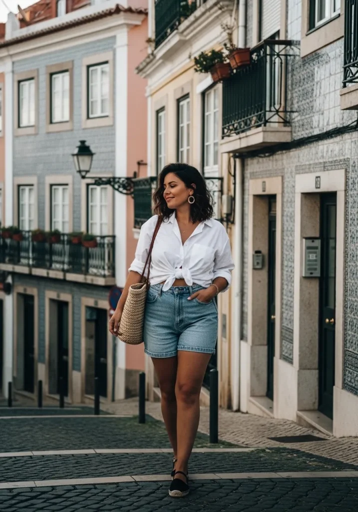 Denim shorts paired with a button-down shirt create a classic and versatile vacation outfit. The structured shirt balances the casual feel of the shorts, making the look polished yet relaxed. It’s perfect for everyday exploring.