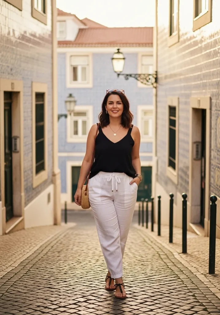 A simple tank top paired with linen pants creates a breathable and stylish outfit for warm days. The lightweight fabric keeps you cool while the relaxed fit ensures all-day comfort. It’s a great option for casual sightseeing or travel days. This combination feels clean and minimal.