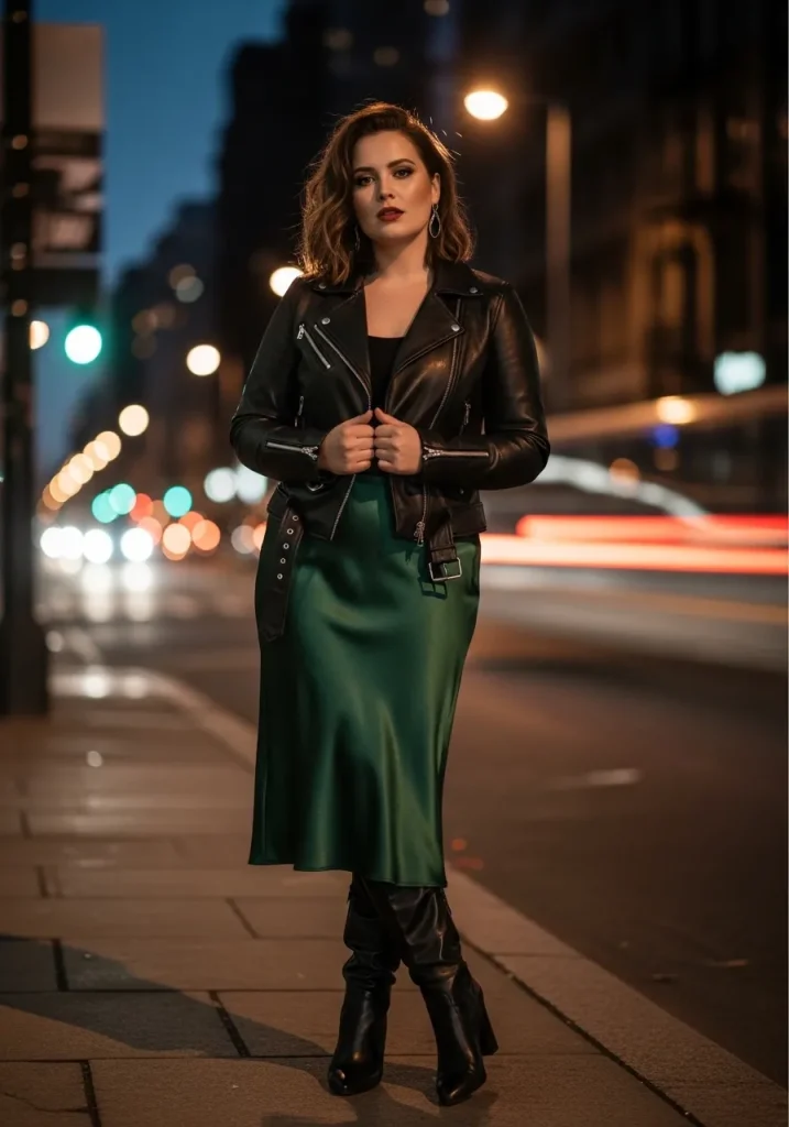 A satin skirt paired with a leather jacket creates an edgy yet feminine outfit that stands out. The contrast between soft satin and structured leather adds depth to the look. It’s perfect for evening outings or bold street style. This outfit feels confident and stylish.