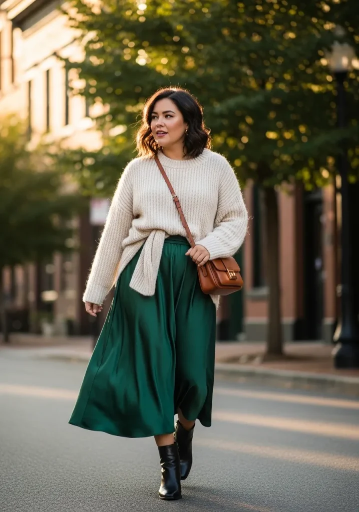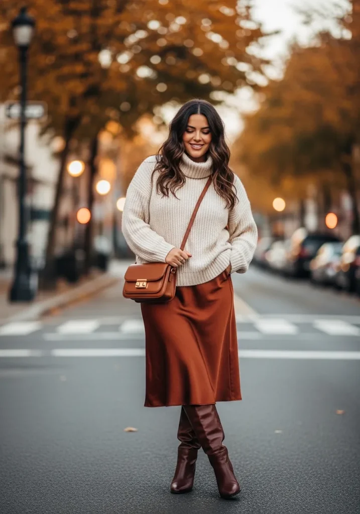A satin skirt styled with an oversized sweater creates a cozy yet elegant outfit that works beautifully for transitional seasons. The softness of the knit balances the sle finish of the satin skirt perfectly. It’s a comfortable look that still feels polished and stylish. This outfit feels relaxed yet elevated.