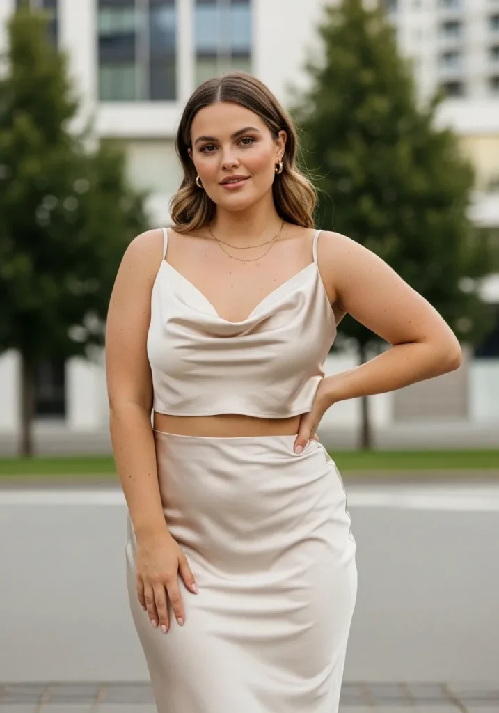 A satin skirt paired with a matching top creates a coordinated and polished outfit that feels effortlessly stylish. Matching sets make it easy to look put-together without much effort. It’s perfect for both casual and dressy occasions. This outfit feels modern and sleek.